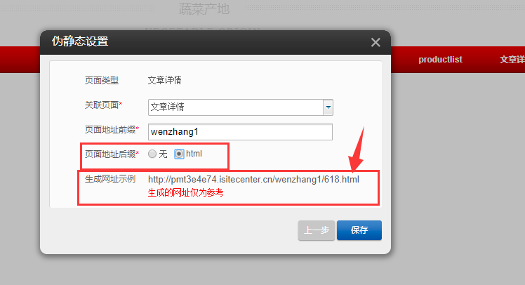 1.以PC版为例,首先在建站编辑器中点击“设置”-“伪静态”-“添加伪静态规则”,选择页面的类型“产品列表”或“文章列表”,进行伪静态的设置,设置完成后点击“保存”,然后在编辑器中拖入“文章分类”或“产品分类”,点击“设置”,将分类链接页面与在伪静态设置中的页面选择一致即可,然后点击保存,如图所示: